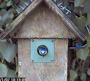 He jumps up to the nest box hole to have a look out and stays there for a while.