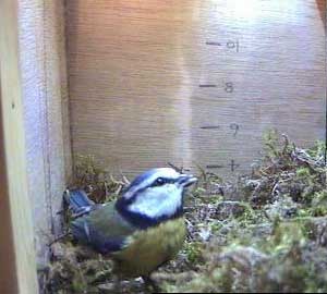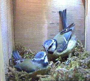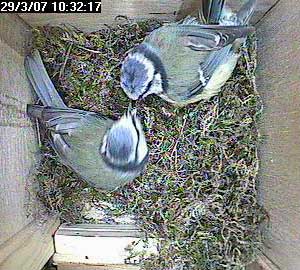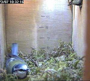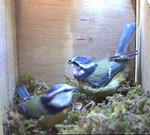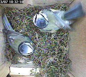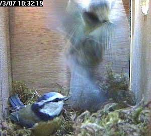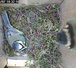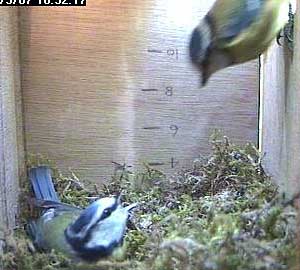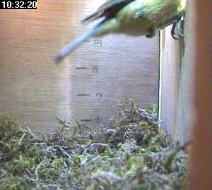 Here we see Abby inside the nest box with Angus coming to the entrance hole. Although you cannot see it, it is apparent from what happens that he is carrying some food for Abby in his beak.