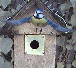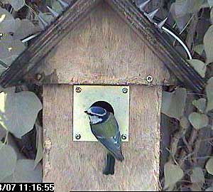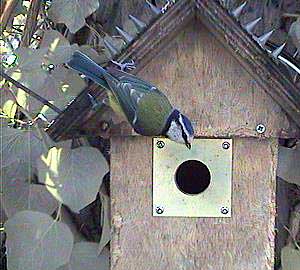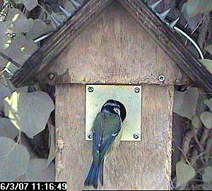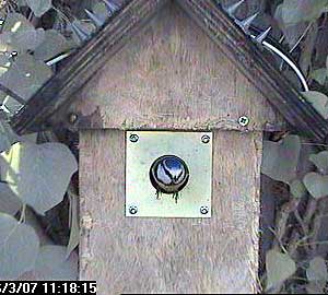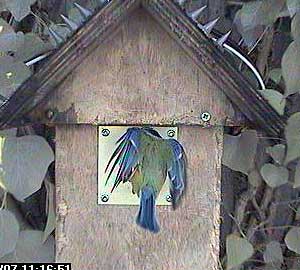 After a brief move away from the box - perhaps to get the female - he's back again - and this time he is on the entrance hole. Yes, it's definitely empty!