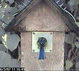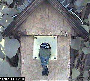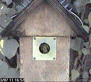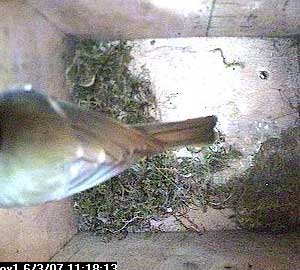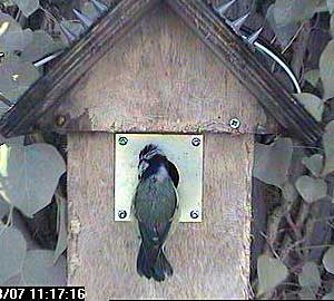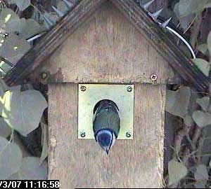 If the male sensed trouble, he clearly didn't give any warning signal. The female continues to behave as though this was her nest box!