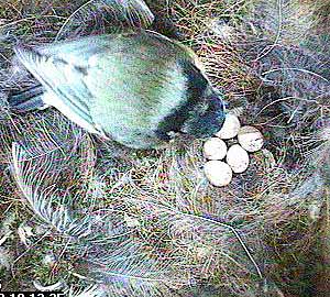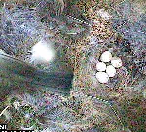 Sally lets us have a rare sight of her clutch which has now reached five in number. She has come into the box at the end of the day to roost, but has taken a last minute look outside before settling down.