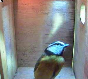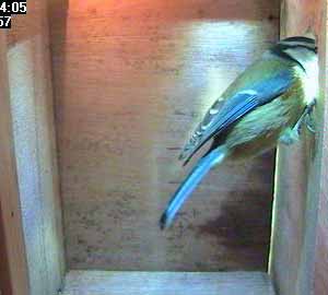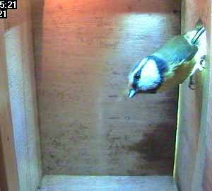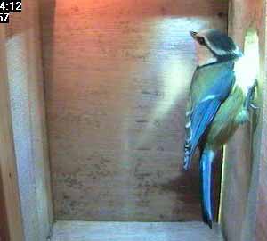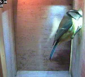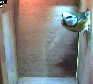 As it went in, the bluetit swivelled around so that it stayed on the entrance hole the whole time. Now it's having a good look outside.