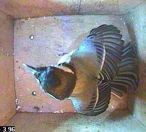 Having spent much of the day inside the box, it was clear by about 17.30 that this bird was going to stay the night. We therefore turned the lights off and watched the outside camera to see if it took fright and left to roost elsewhere.