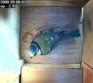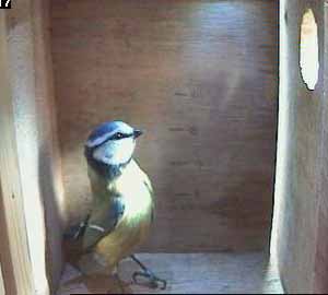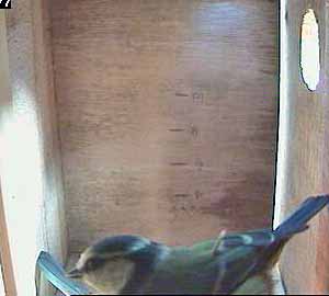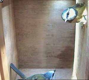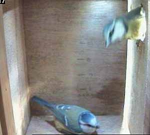 Nearly an hour later, both birds are back in the box again. Here again you can see Angus crouching down to avoid Abby as she comes in.