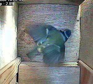 Again, Abby lands on the slope, well out of the way of Angus. This must be a bigger hole than bluetits normally use for their nesting sites.