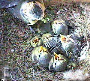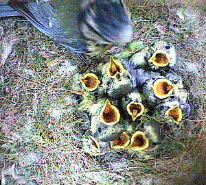 Mum (or is it Dad?) with food for her 10 chicks! All 10 gapes are clearly visible here - the least obvious one is the partially open beak in the bottom left of the nest cup.
