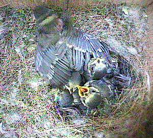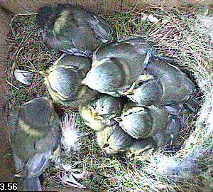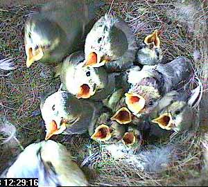 Ah! A much more restful scene taken in mid afternoon. A couple of the chicks are resting well out of the nest cup - and two more must be buried somewhere deep at the bottom - I can only count 8 heads here!
