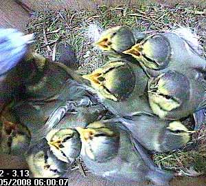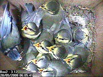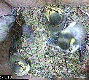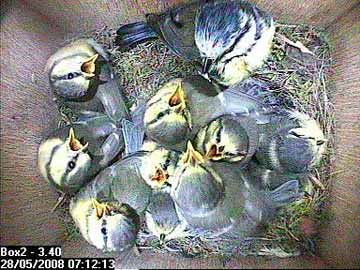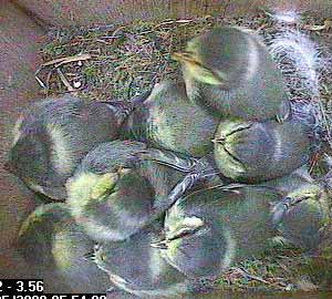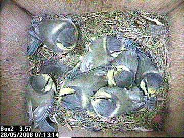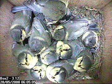 An hour has passed since the picture above and all ten chicks are still in the box. What's more none of them has been showing any signs of leaving, such as hopping up onto the nest box hole to look outside.
