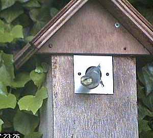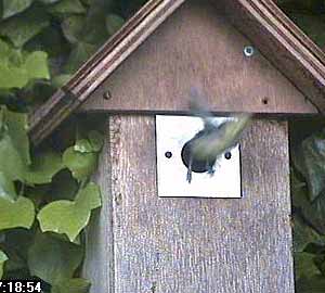 We now can see pretty clearly that there are only seven chicks in the box - including the one perching in the hole. That means that three chicks have fledged although we haven't managed to capture a picture of more than one actually in the air.