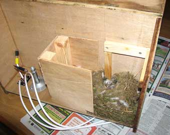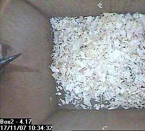 Elizabeth thought you might like to see the inside of Box3 as it was before I took last year's nest out. The side mounted camera was positioned on the silver mount you can see on the left of the picture. The inner construction, or skin, which in this picture has its roof removed, is to contain the birds within the nesting area and prevent them from getting at the camera. This pokes through a hole in this skin barely bigger than the lens to enable it to watch the nesting birds. The other camera sits directly above the nest on the right hand side just as in the other boxes.