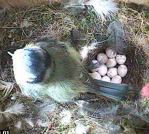 Bella has left the nest box and shows us her 12 (yes, twelve!) eggs. This is a record clutch for us although our field guide says that bluetits can lay up to 16 eggs!