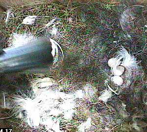 Almost immediately, Bella is back with a feather to cover her eggs up with.