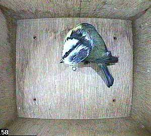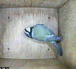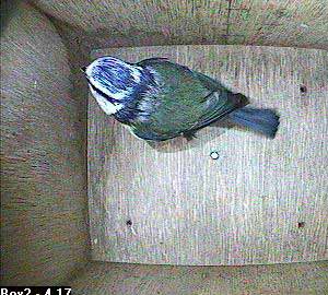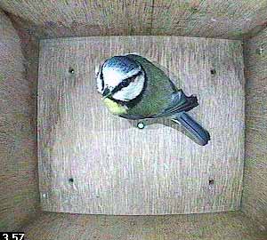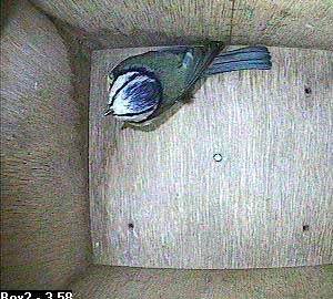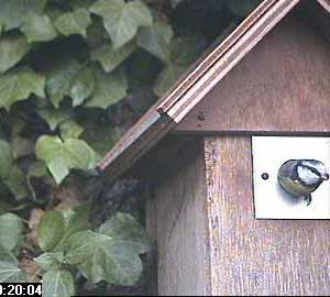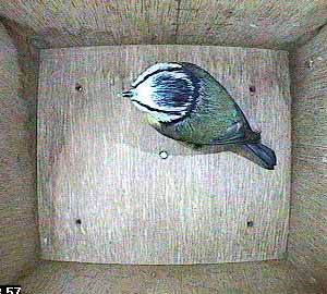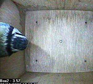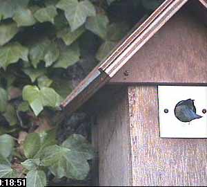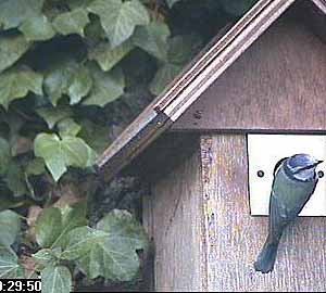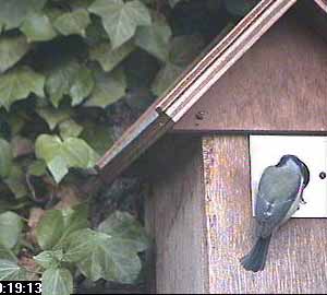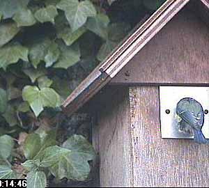 Twenty seconds later, while the original bird is still inside, another bluetit comes to the entrance. Is this a pair or are they competing for ownership of the box?