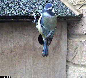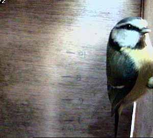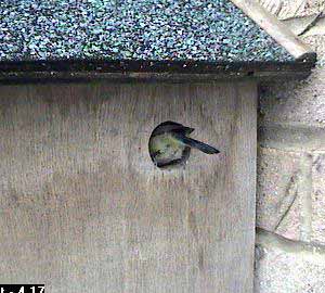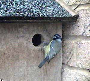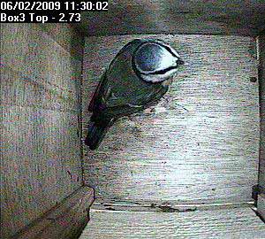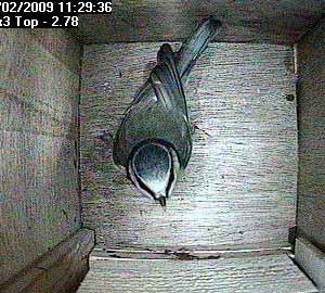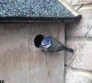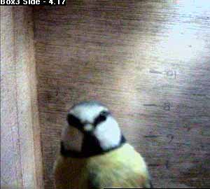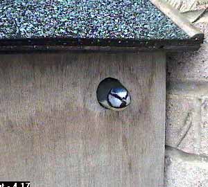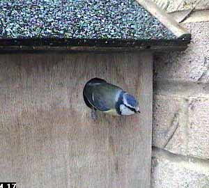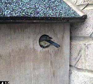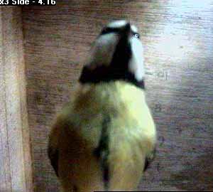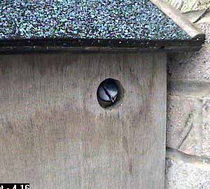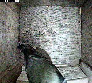 As usual, he hops up to stand on the shelf that is inside just below the camera lens hole - which means he is too close to the camera for a good picture. I hope that this shelf doesn't cause too many problems during the nesting season!