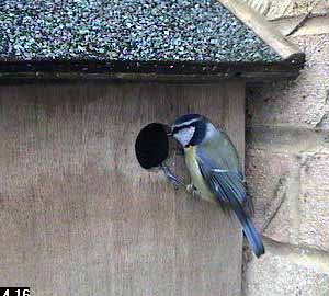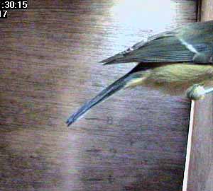 ... he swivels around while holding onto the box by the edge of the entrance hole ...