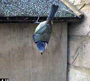 An hour later it, or another bird - without their being ringed we cannot tell for sure, was back. This time is hung from the roof of the box to start with.