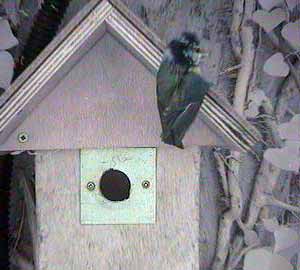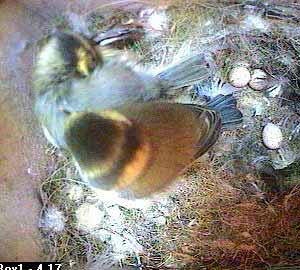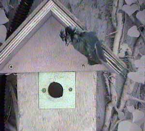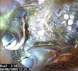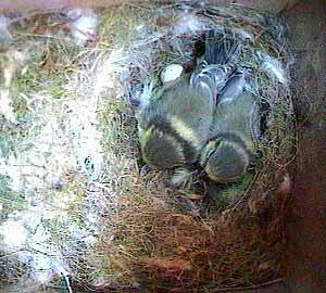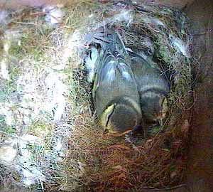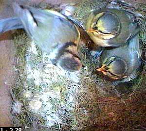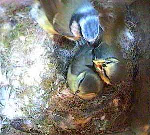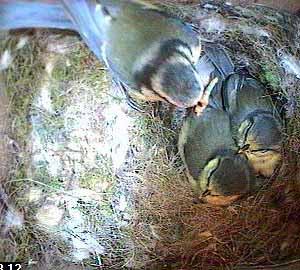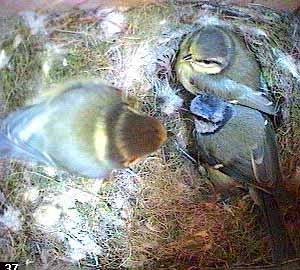 All during Fay's occupancy of this box, we have had the odd visit from a male bluetit with strangely patterned face feathers. Fay's original partner, Bill, looked like this but this bird has this problem in spades!