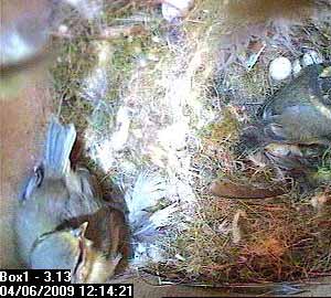 She then decides to give the nest cup a clean. Fay is the bird on the bottom right of this picture and looks smaller than the chicks because she is low down in the nest cup.