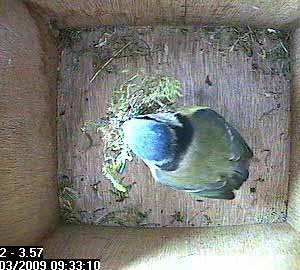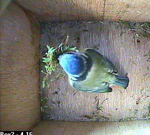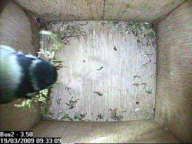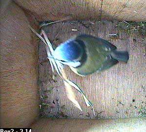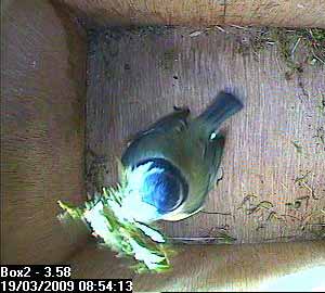 There goes Bella with her nesting material still in her beak.