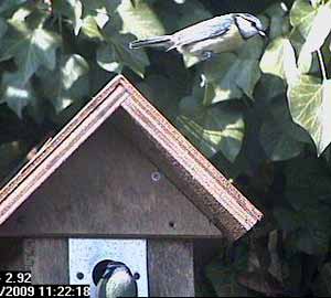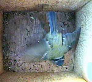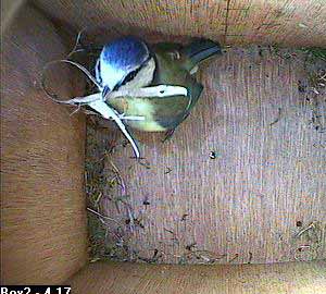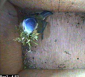 This is the silly season for nesting bluetits. Both Box1 and Box2 have been taken over by a pair of bluetits, and in both boxes the female is still only playing at nest building. Box3 is still more open. There have been bluetits and great tits regularly visiting it, but no birds have yet claimed ownership of the box.