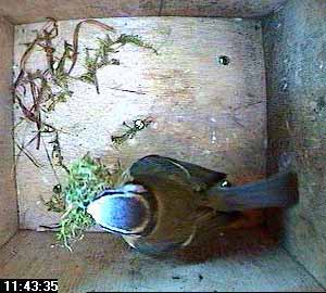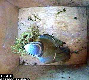 Half an hour later she brings in some moss. But where is the hay she brought in earlier? Where indeed is the nesting material she has been bringing into the nest box these past few weeks?