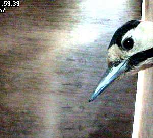 In this melee, you can just make out Bella battling for her chicks! She seems to have done the trick though, the woodpecker has let go of the nest box in order to deal with Bella.