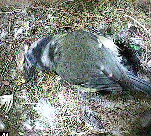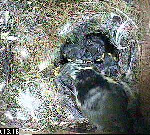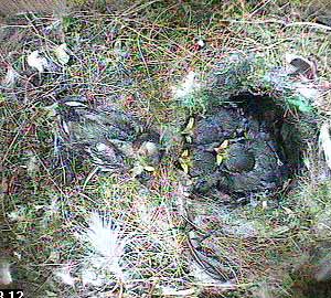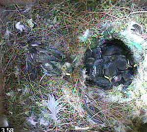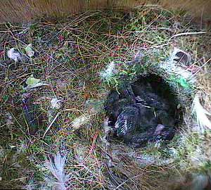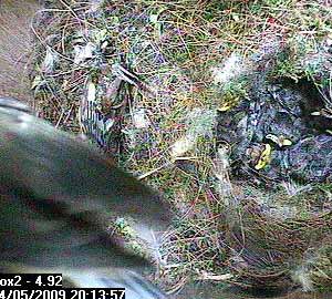 This, and the entry for Friday have not been easy to write. One of Bella's chicks died some time before Thursday afternoon, but we didn't notice until Friday morning. Using Replay, you can see that during Thursday, there are many more flies buzzing around than you normally see, so perhaps this chick died on Wednesday or even earlier! Bella discovered it today (Thursday) and tried to remove it from the nest box, but failed.