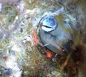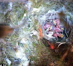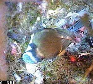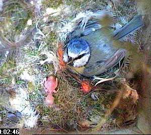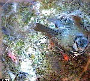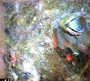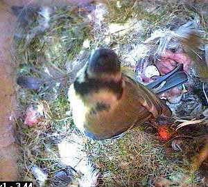 When Fay comes back, it is still there and has got itself partially covered by nesting material. You can just see a pink blob covered by nesting material and lying beneath the nest box hole.