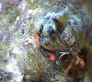 As Fay finishes digging in the bottom of the nest, the chick starts crawling in the wrong direction - away from the nest cup!
