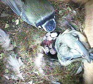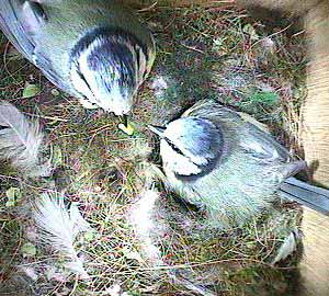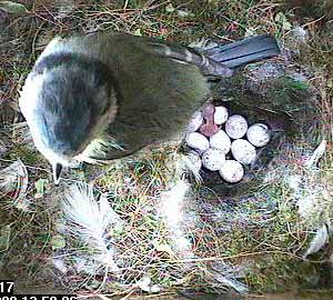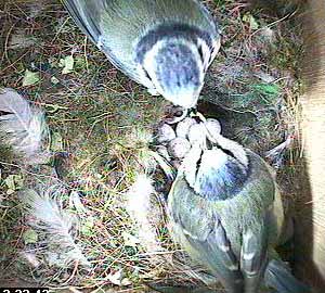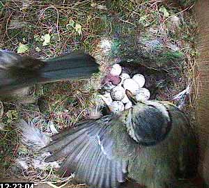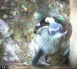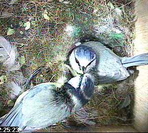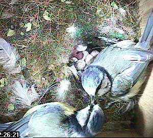 Four minutes later, Bertie comes into the nest box as normal with a mealworm for Bella and we catch our first glimpse of the recently hatched chick.