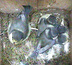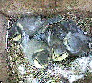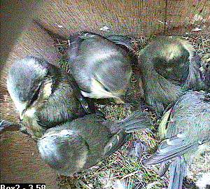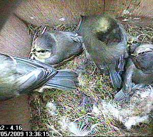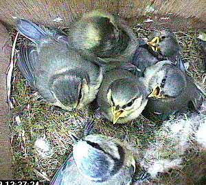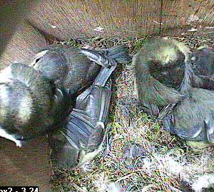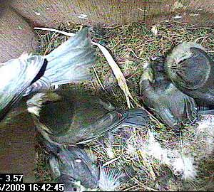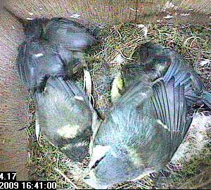 Six hours have passed since the last chick fledged, and the remaining five chicks seem have started egging each other on to follow him - at least three of them have. The other two don't want to know in spite of Bella making life uncomfortable for them by diving down in the nest cup!