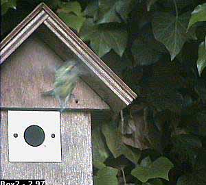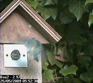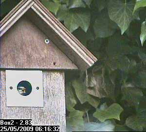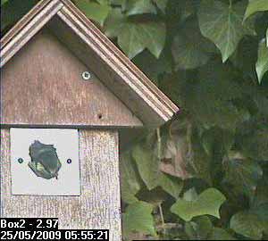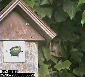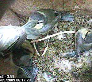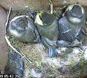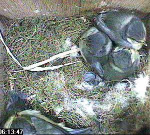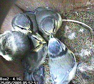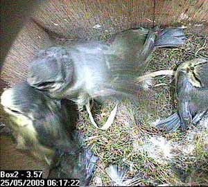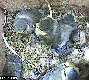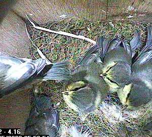 The first picture that was taken shows four chicks in the nest cup and Scrap lying in the left corner of the box beneath the exit hole.
