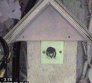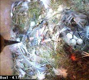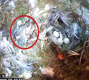 Because it is difficult to see, I have ringed the body of the chick. It has fallen directly beneath the hole and an inch or two away from the front wall of the nest box.