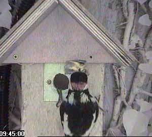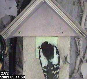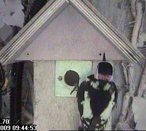 To our relief, we haven't seen the woodpecker since his fight with Bertie at the other box (is that when Bertie disappeared?) That was over two weeks ago. Then within four minutes of Fay dropping the dead chick's body in a place that is accessible to a woodpecker, one arrives at the nest box!
