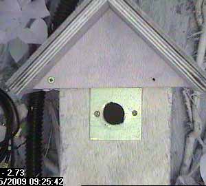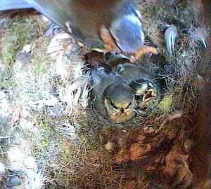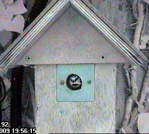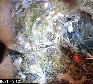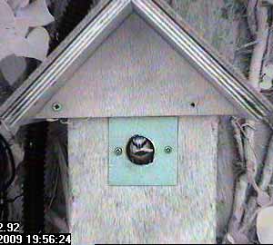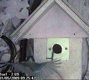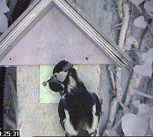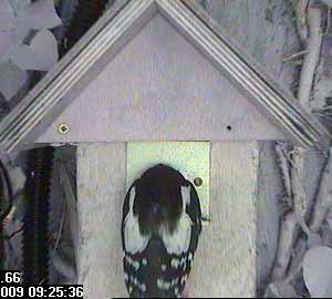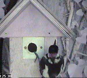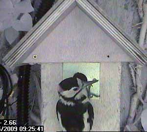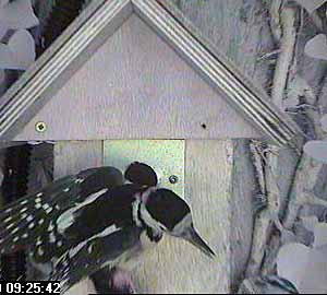 In the picture you can see Fay having a go at Spotty, who appears to be hanging from the nest box hole, upside down, with his white and pink tinged belly facing the camera. A most undignified posture for a woodpecker!