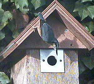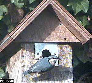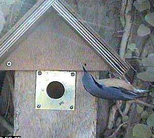 Is he trying to go inside? The books say a nuthatch needs an entrance hole of at least 32mm diameter and this one is only 28mm across so the chances of his getting in are pretty small.