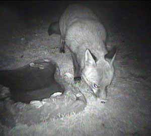 Finally, a fox frequently passes through our garden as part of his night time prowling. Here he looks as though he is trying to eat the remains of the food scattered on the ground beside the bird bath.