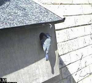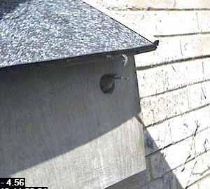 At last, the bird outside comes to the box. Soon after, it comes to the entrance.