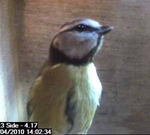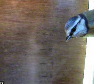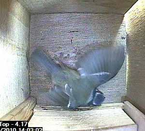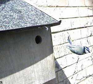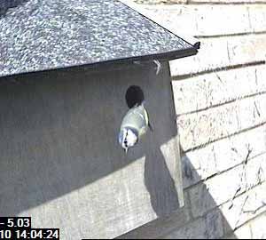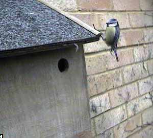 A bluetit lands on the entrance hole.