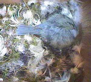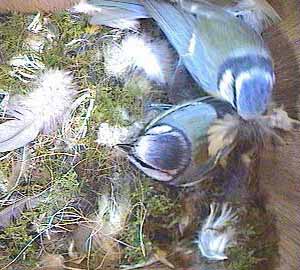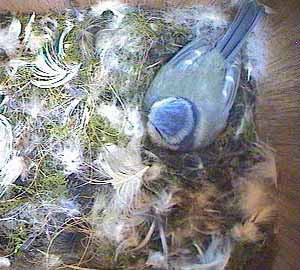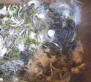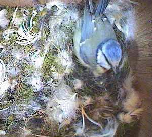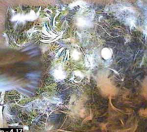 Donna has been bringing more feathers into the nest box all day. This time she found that Mick was already in the box when she arrived.