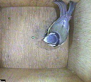 Within 24 hours of reinstalling Box2, it had a visitor. I'm not quite sure why bluetits are interested in nesting boxes at this time of year - let alone at a time of sub-zero temperatures and widespread snow! Perhaps it is looking for a warm and cosy roosting site?