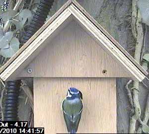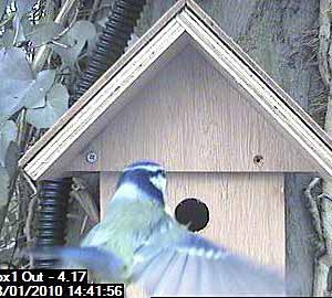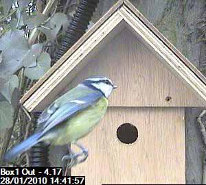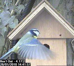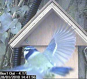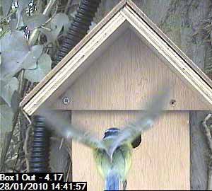 This is the first of the sequence and appears to show a bluetit coming in to land on the roof of Box1.