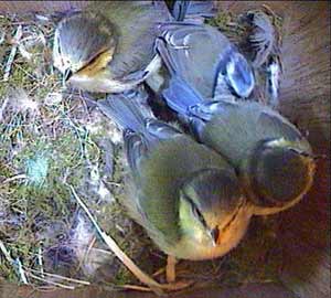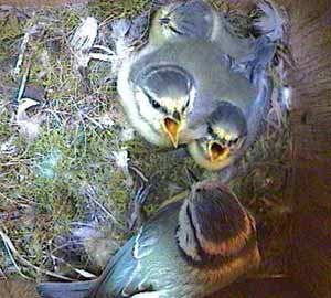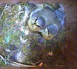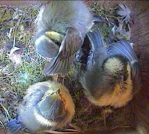 It is now 5 to nine and all three chicks are still in the nest box. (In case you can only see two, the top two are sitting on the third one whose head and beak can just be seen at the top of the picture.)