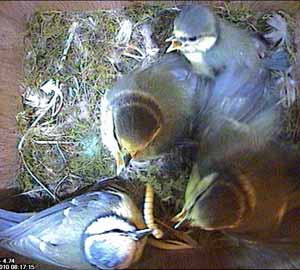 It's now a quarter past eight and Elizabeth has been out topping up the mealworm feeders. Almost immediately, Donna collects one for her chicks.