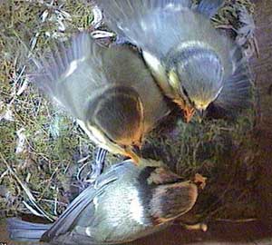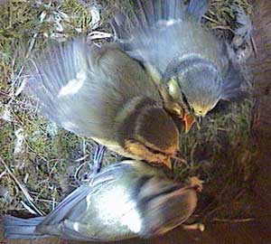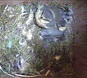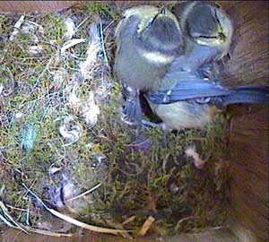 The remaining two chicks clearly don't want to have anything to do with the silly idea of leaving the nest box. It seems an almost universal habit for the remaining chicks to huddle together in the nest cup whenever one of their number fledges.