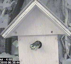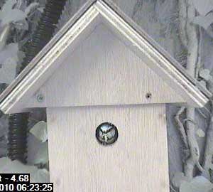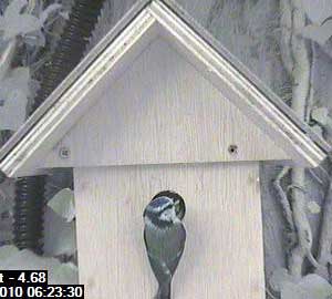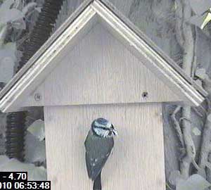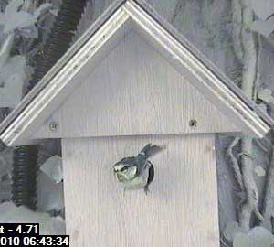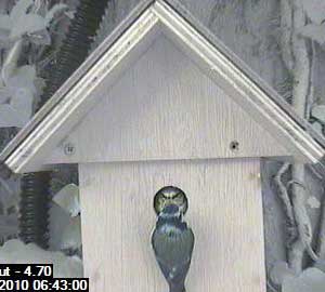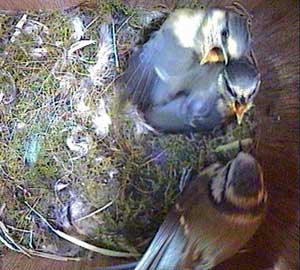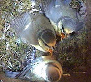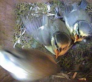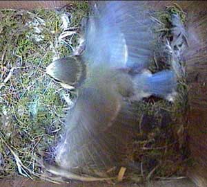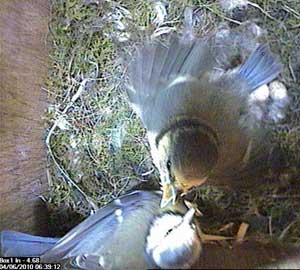 Donna comes to the nest box again and this time she feeds the chick. In fact she does this several times during the next few minutes.