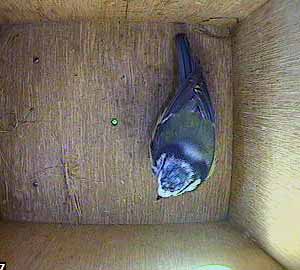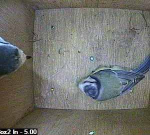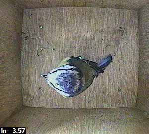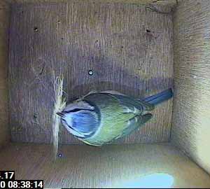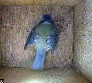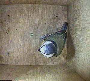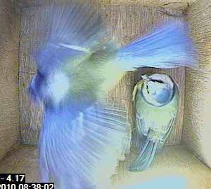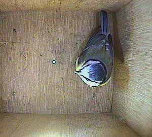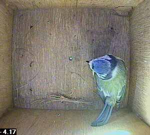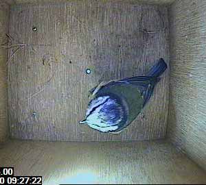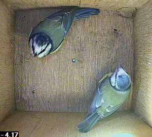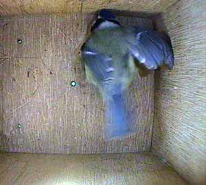 The wriggle usually ends with the female hitting her head on the side of the box! What happens inside bluetits' nesting sites in the wild, I've no idea!