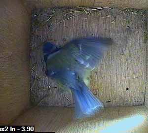 Suddenly Sam comes to the entrance hole - and Della greets him by fluttering her wings and saying a few sweet words.