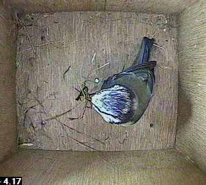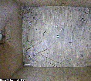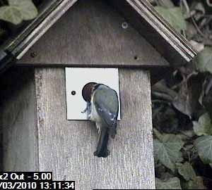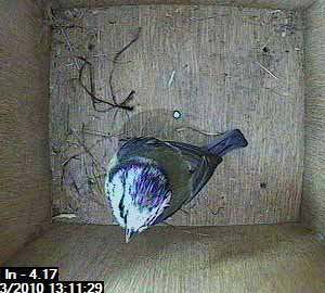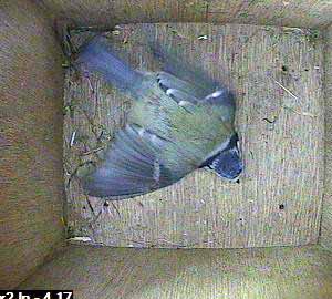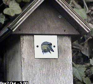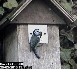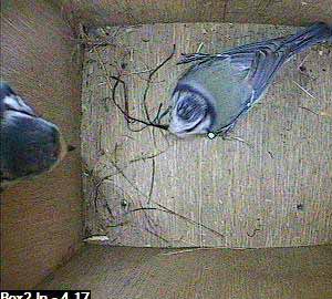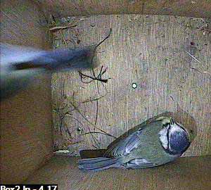 Who is this bird on the nest box entrance? As this is Box2, it must be Della as it has some nesting material in its beak. It doesn't look very much like Della though. Perhaps it is an interloper?