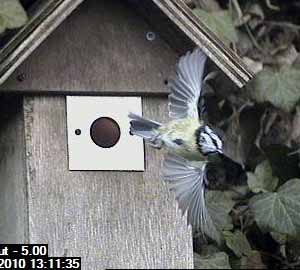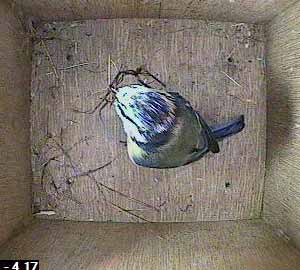 My goodness! This isn't Della at all! It's Sam, the male bluetit! What on earth is he doing bringing in nesting material? Doesn't he know that is the female's job?